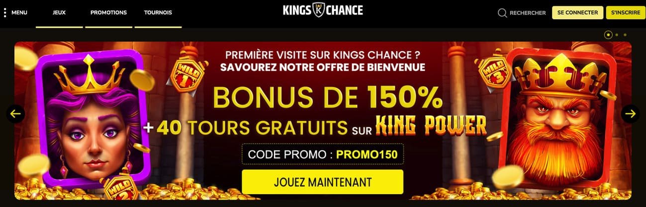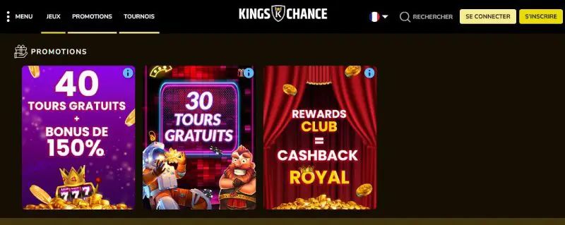 Kings Chance adopte une stratégie très centrée sur les promotions. L’offre principale du casino annonce un bonus pouvant atteindre 10 000 € accompagné de 120 free spins.
